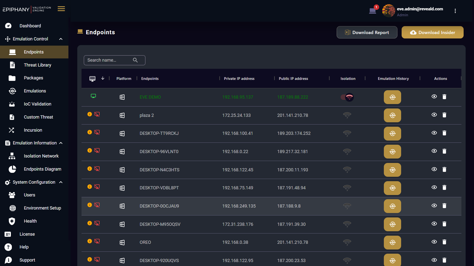 In the upper part the Title of the Page: EndPoints and the options of "Download Report" and "Download Agent".