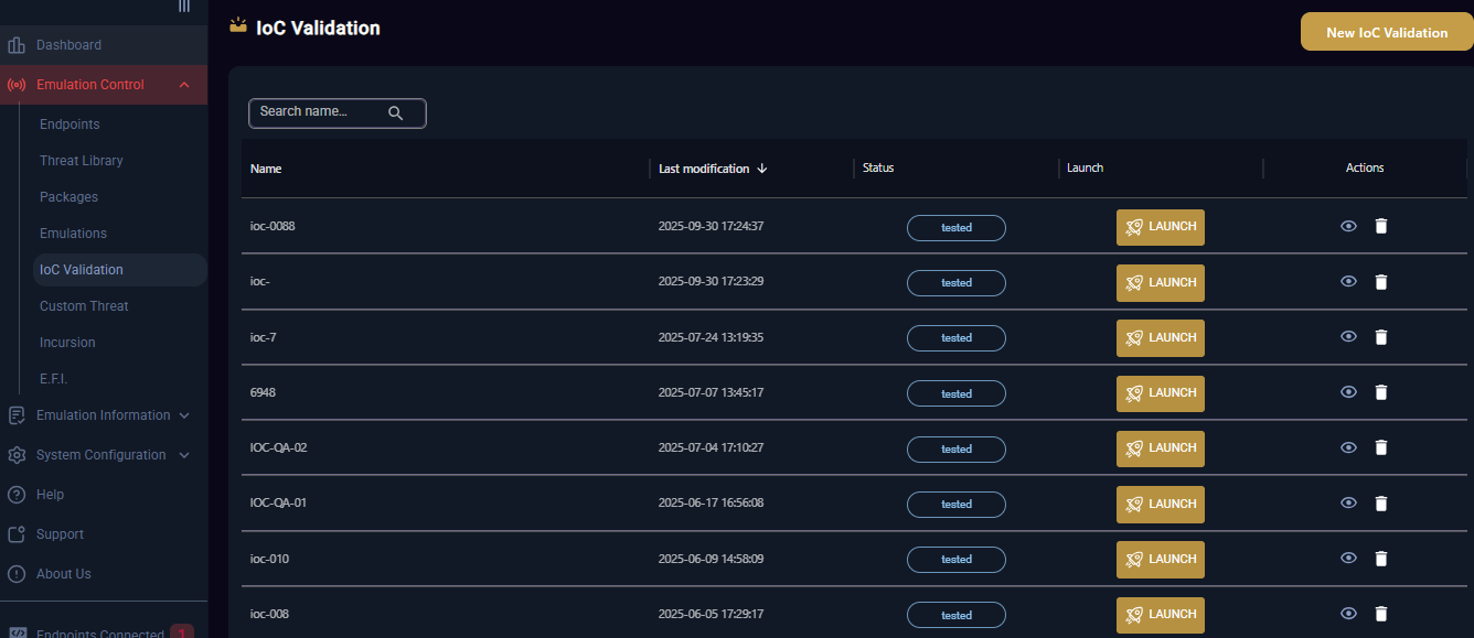 Holds the information regarding the IOC Emulations performed, where the Name of the emulation, the date it was modified, the status of the emulation, the emulation option (Launch) and Actions that can be taken are presented.&#x20;