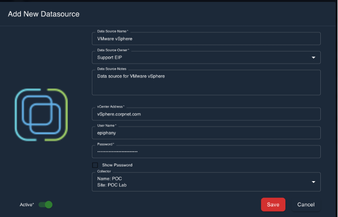 Add a data source name, select an owner and add a pertinent notes about the data source. Enter the vCenter hostname in FQDN format and the vCenter username and password. Select the on-prem Epiphany collector it will be assigned to, mark the data source as ‘active’ and save.